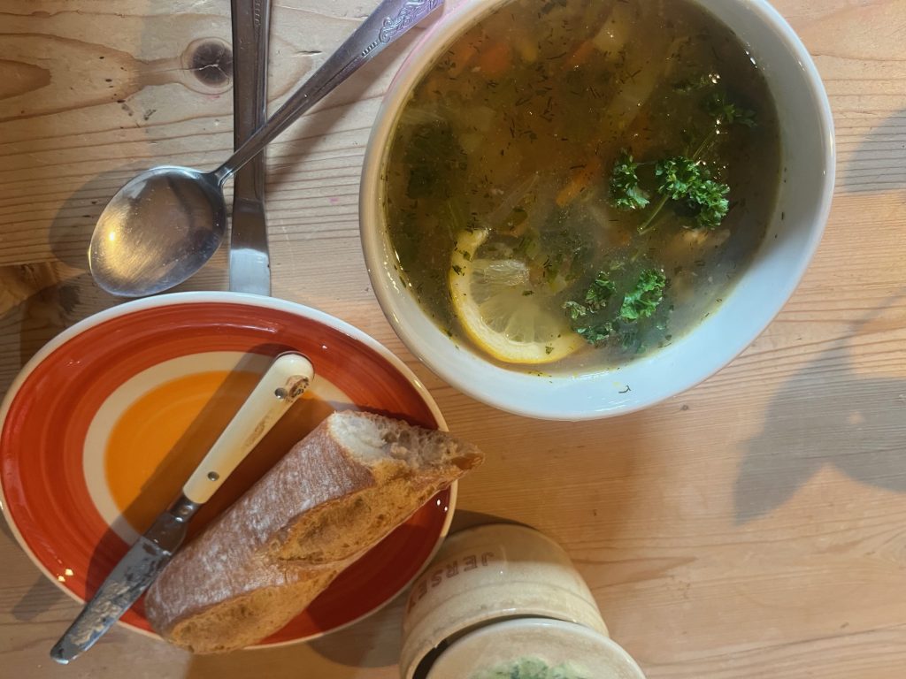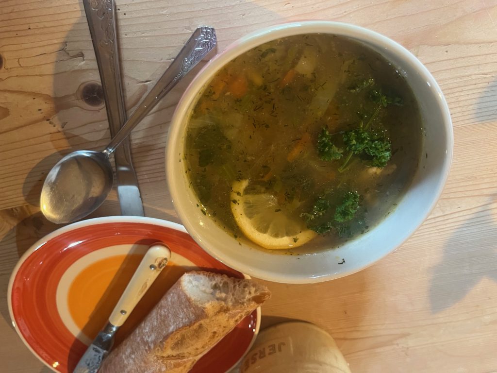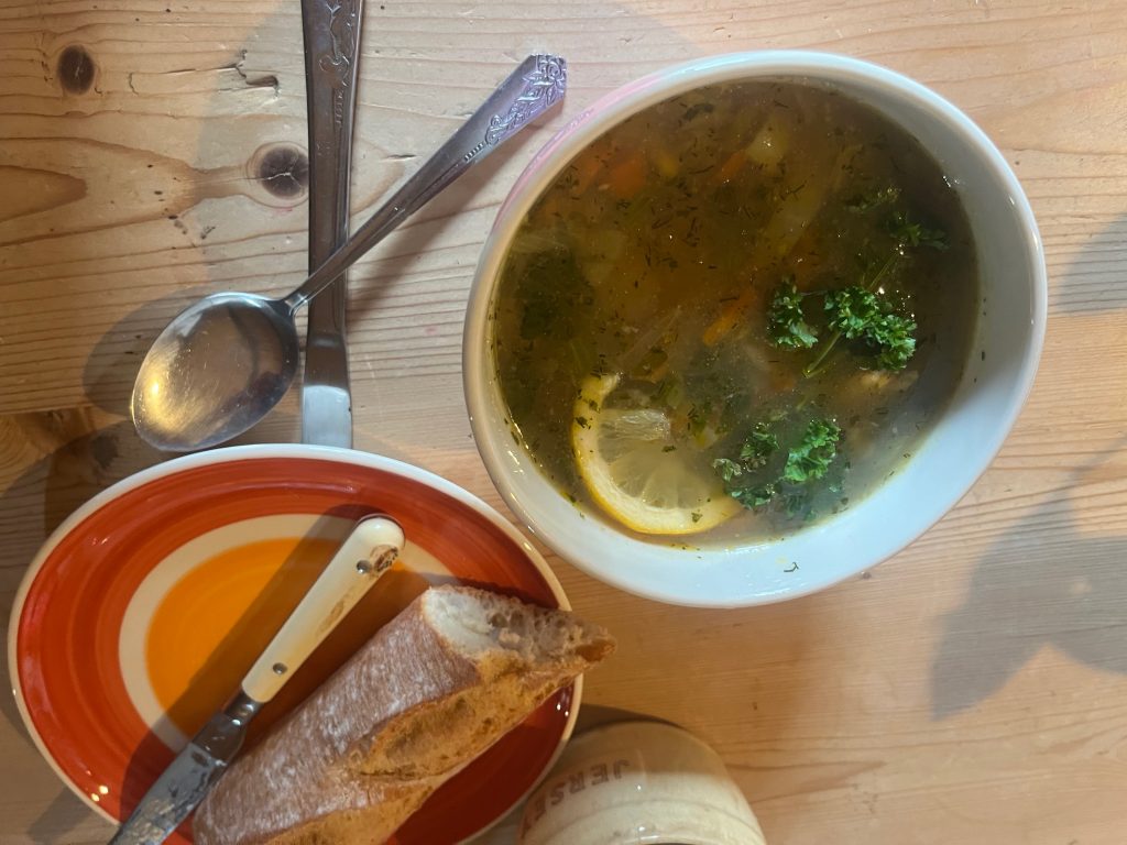 As for the vegetables from the broth — yes, you can use them. I chop them and add them to the soup. I try to minimise waste, especially food waste.
